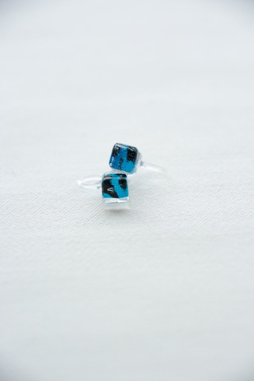 小さめのスクエアキューブに、ビビッドな京友禅・彩纈染めを閉じ込めたアクセサリー。