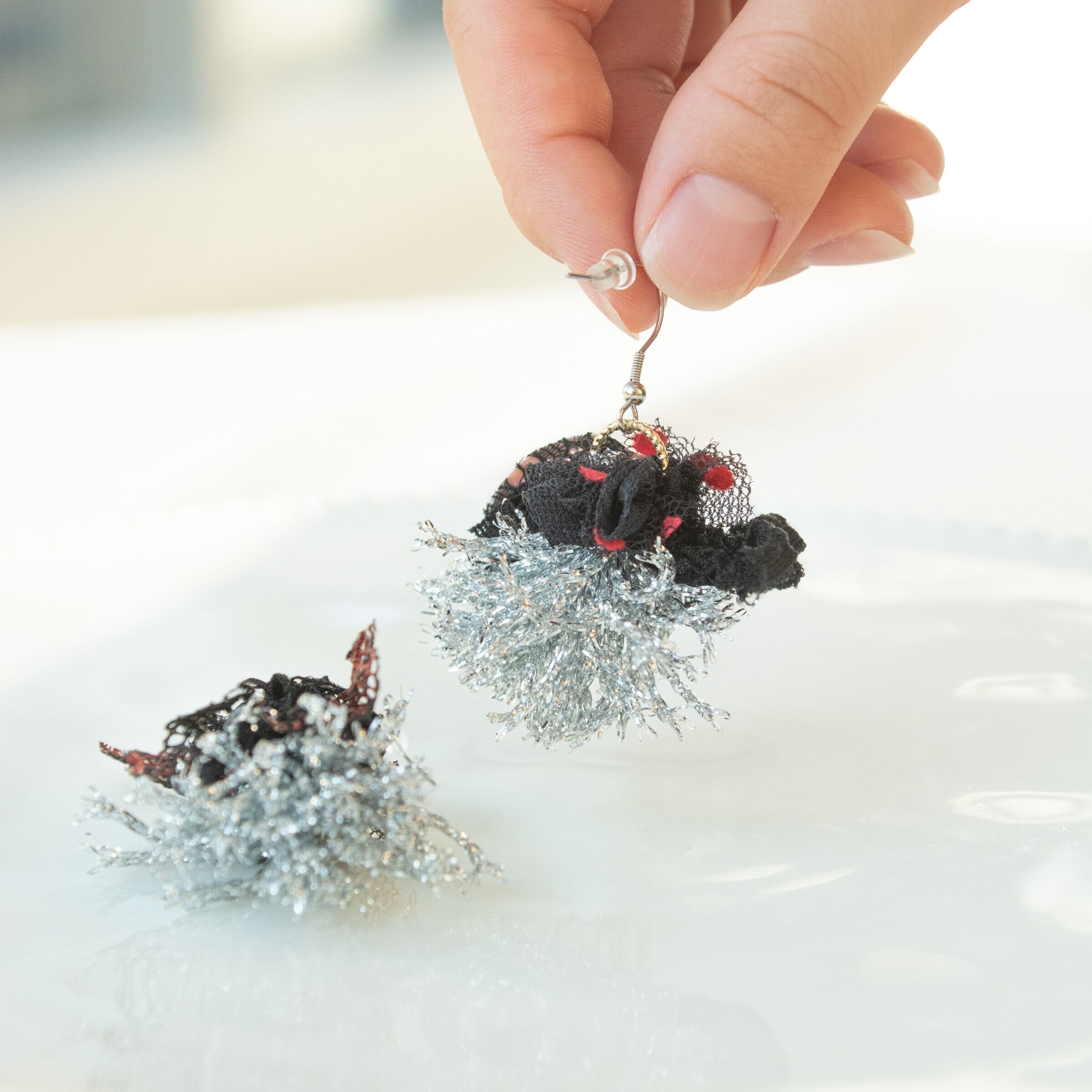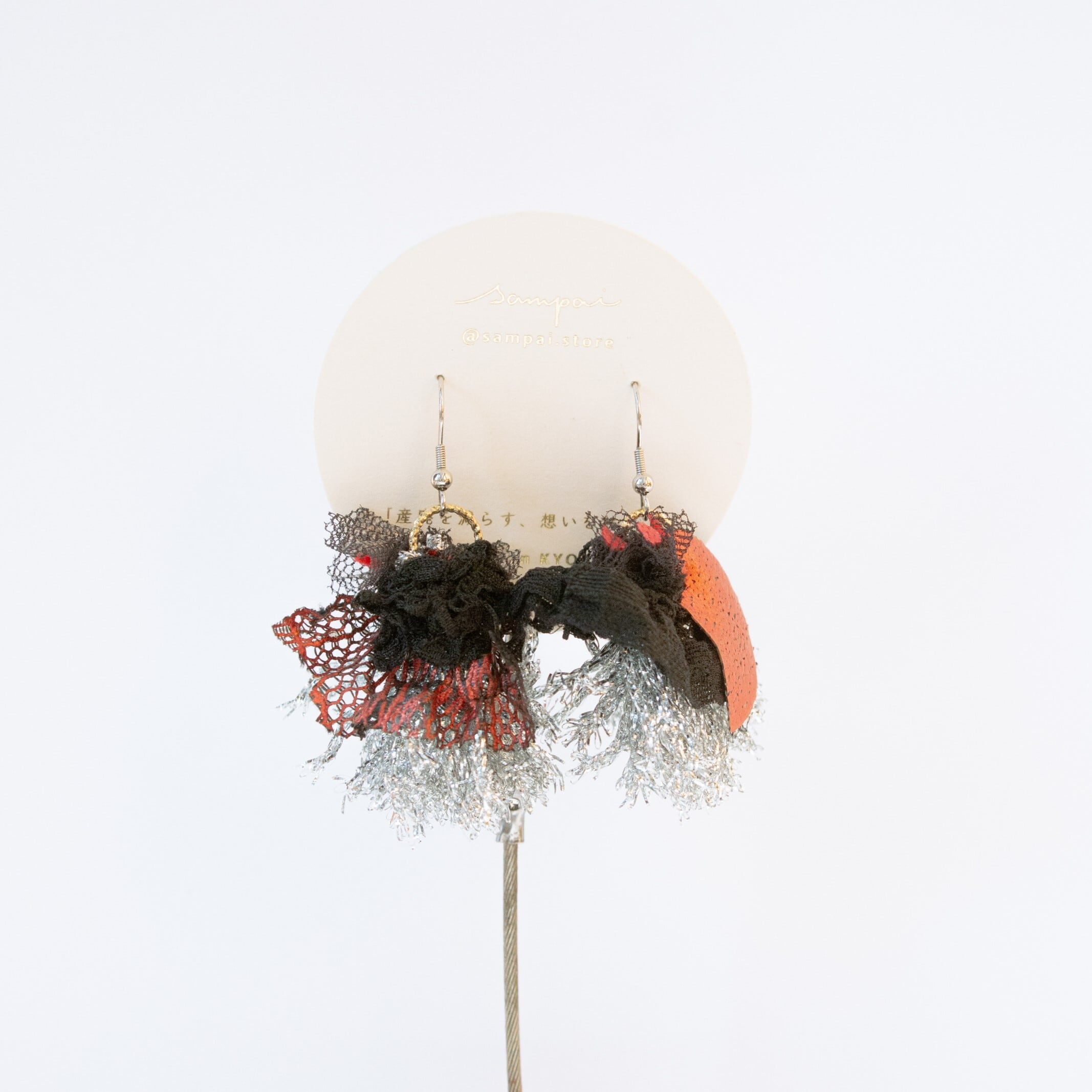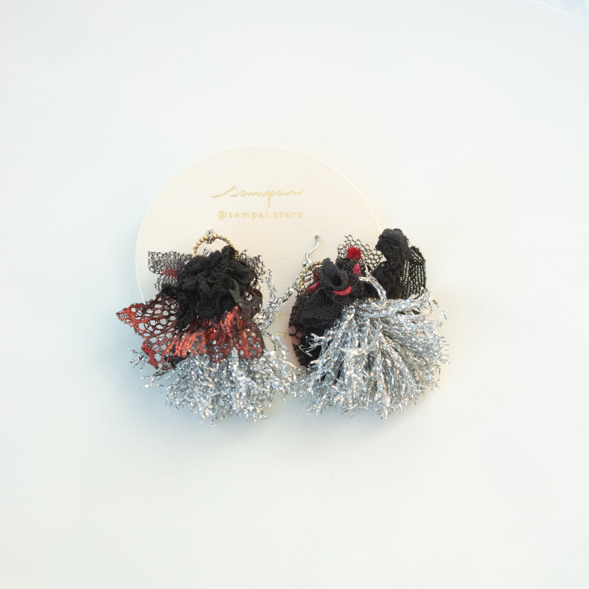 光沢のある赤レースと赤×黒の水玉レース、そして華やかに煌めくシルバーのレースを重ねた存在感抜群のピアス。