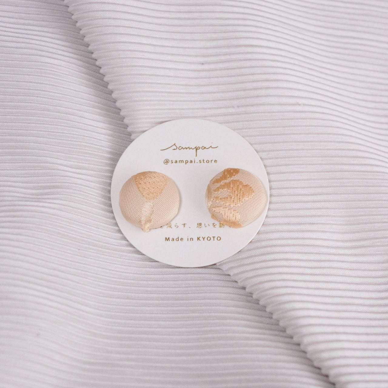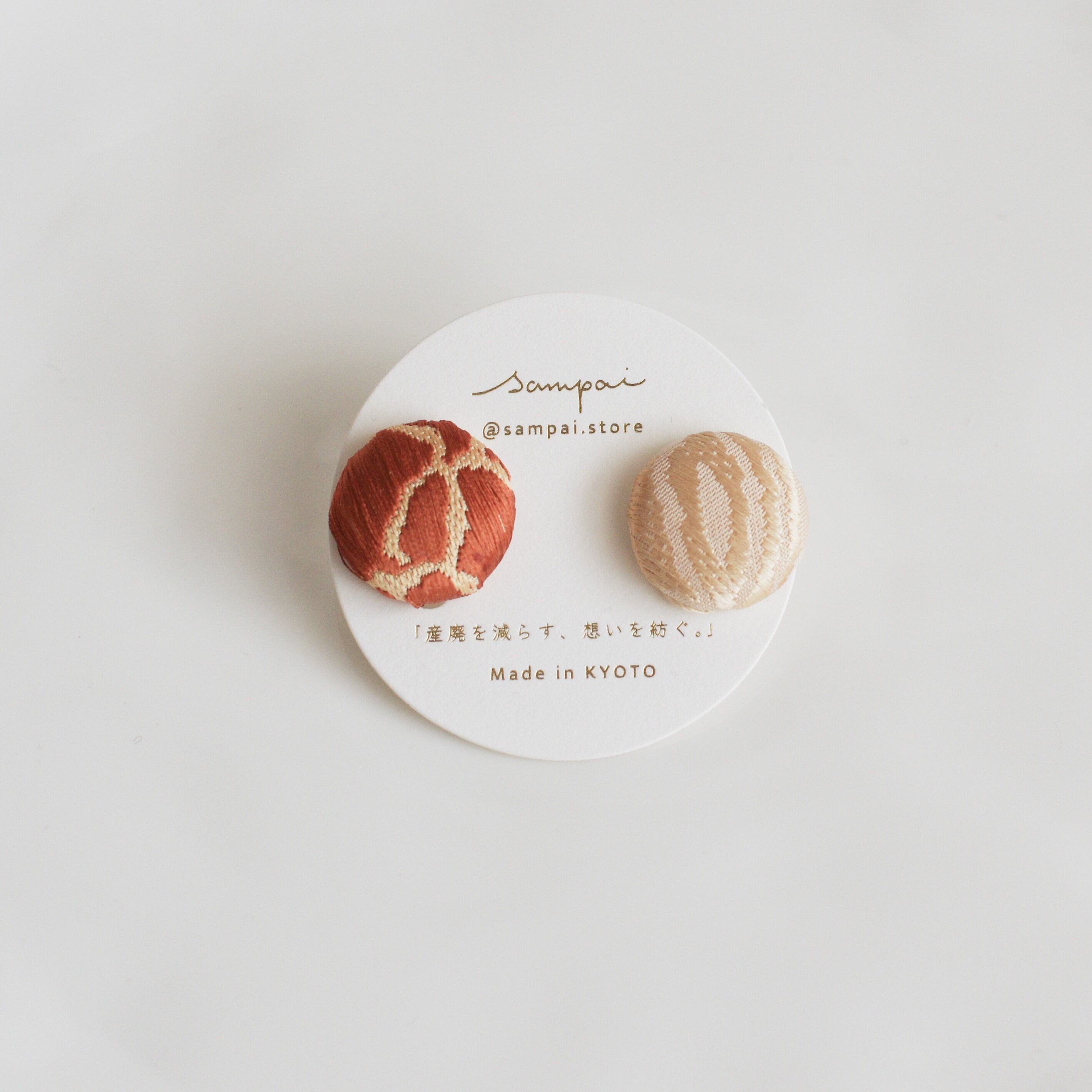 西陣織の美しい柄をぎゅっと閉じ込めた、くるみボタンのアクセサリー。職人が織り上げた試作品"ます見本”の小さな生地を活かして仕立てました。ひとつひとつ異なるデザインで、個性と存在感がさりげなく引き立ちます。
