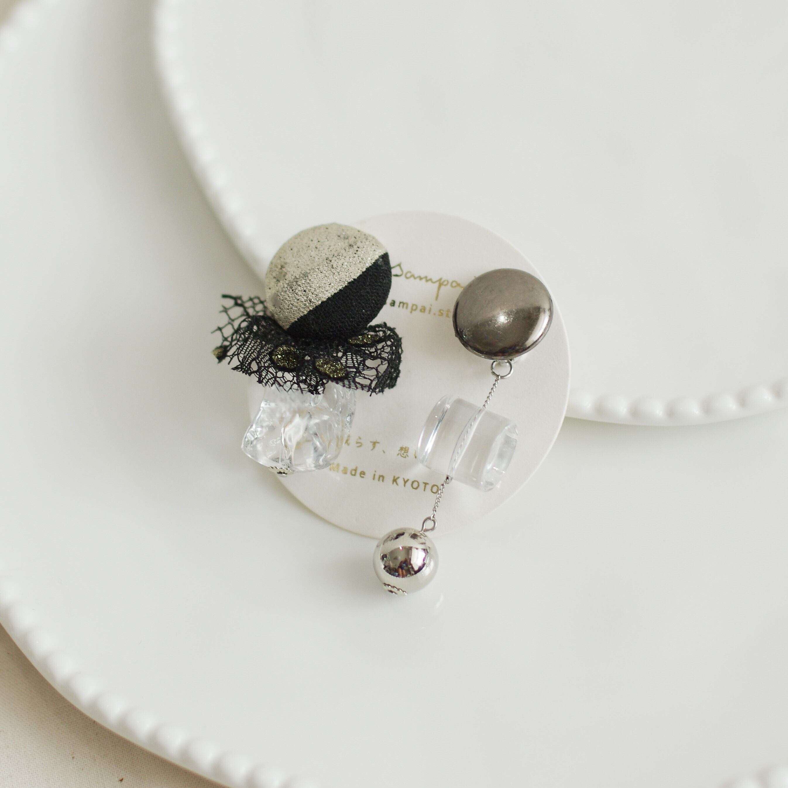 箔付きの黒レースやメタルパーツを大胆にあしらったアシンメトリーなアクセサリー。