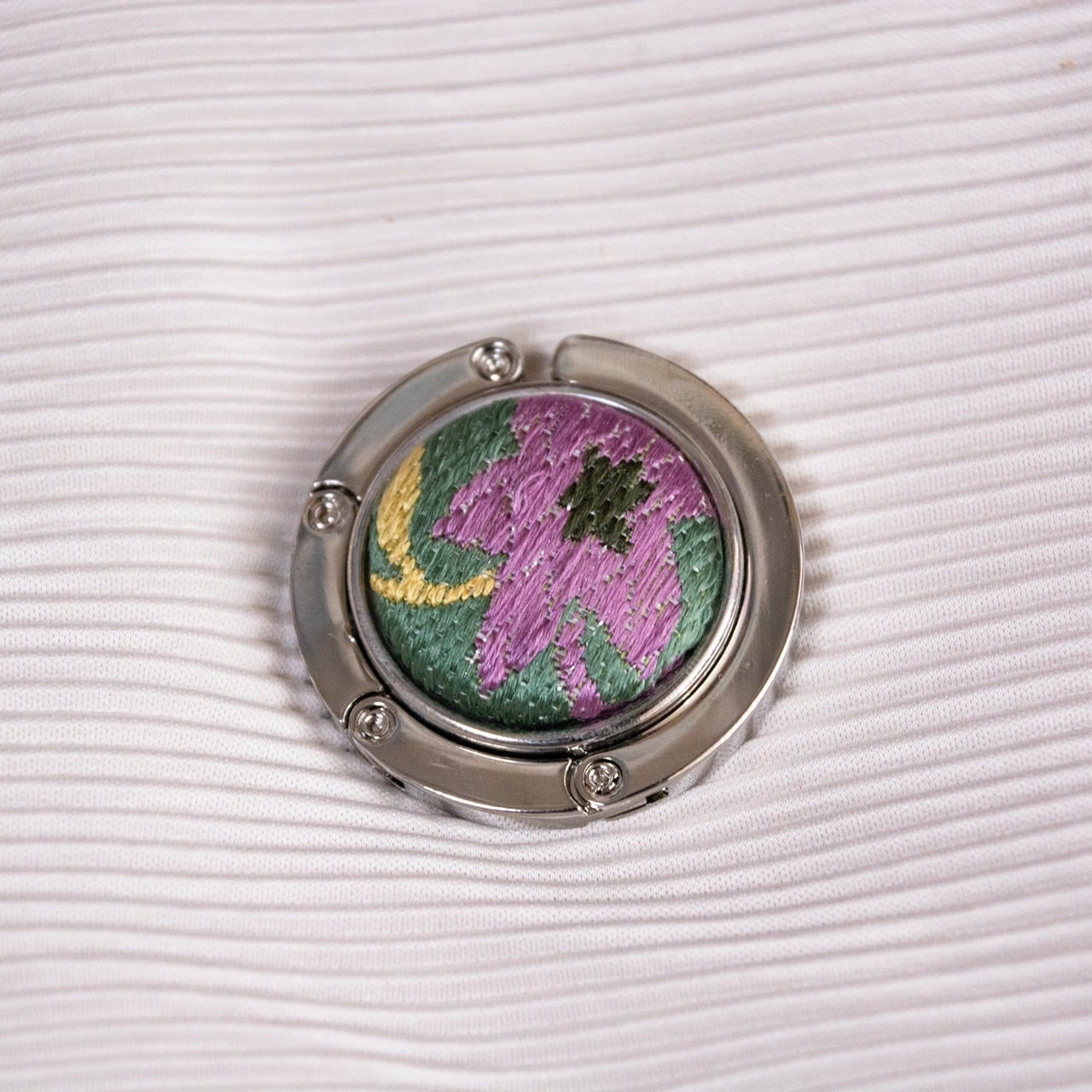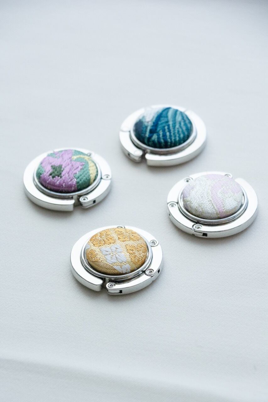 西陣織の見本生地や帯の端切れを再利用し、ひとつひとつ異なるデザインに。アクセサリーよりも大きめのサイズ感なので、西陣織の色彩や文様を存分にお楽しみいただけます。