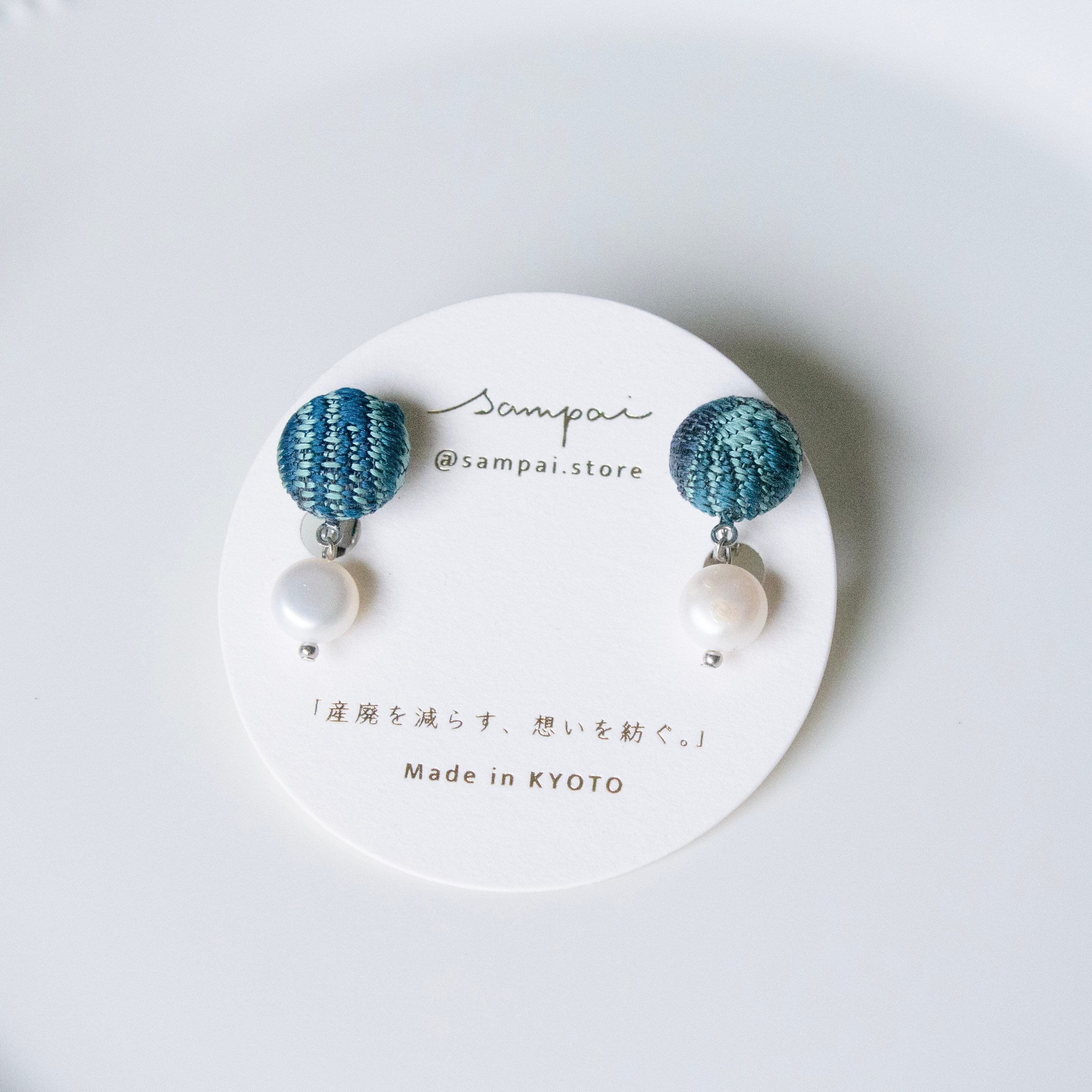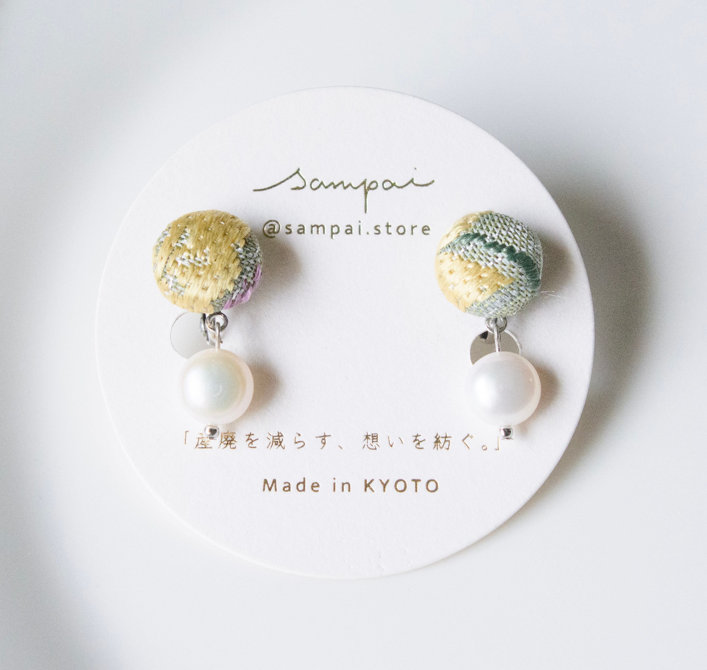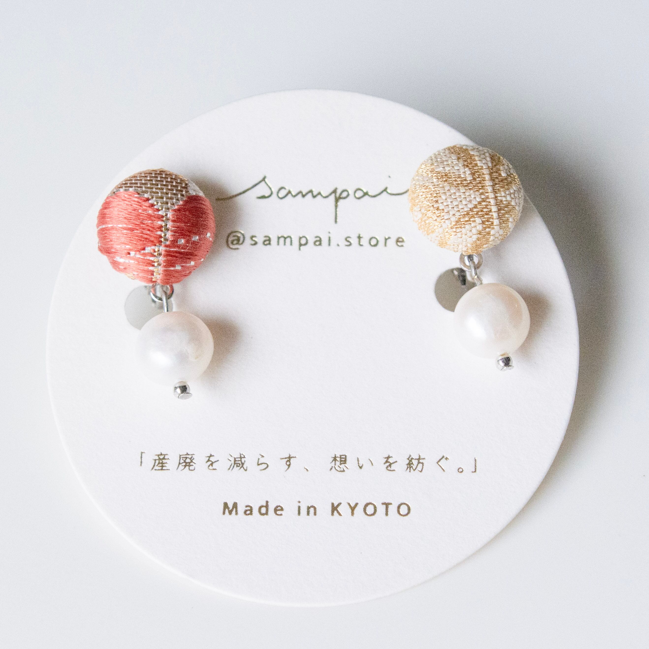 職人が丁寧に織り上げた西陣織の見本生地や帯の端切れを再利用し、唯一無二のデザインに仕立てました。西陣織の下には淡水パールをあしらい、上品さと可愛らしさをプラス。