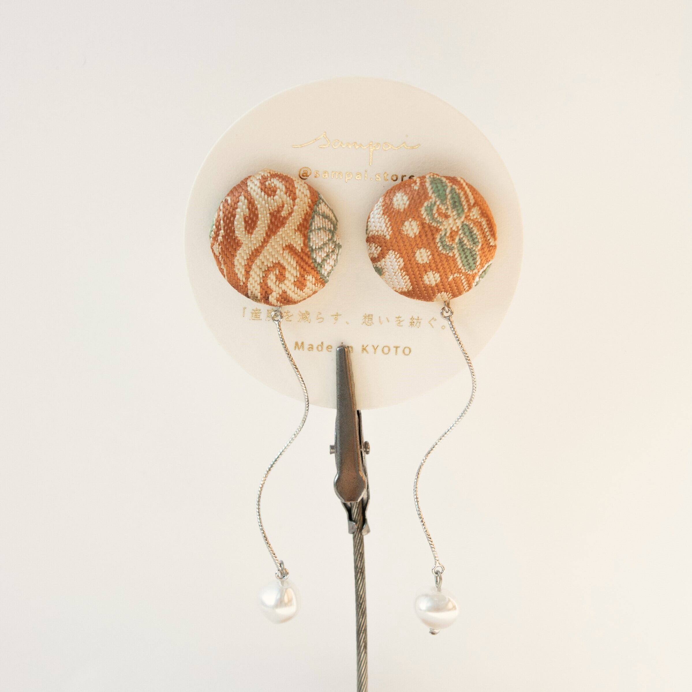 西陣織の職人が見本として織り上げた”ます見本”を余すことなく活かしたアクセサリー。西陣織ならではの色彩と文様の美しさが引き立つデザインに仕上げました。揺れるパールがアクセントとなり、絹織物の上品さを日々のコーデに可愛らしく取り入れることができます。